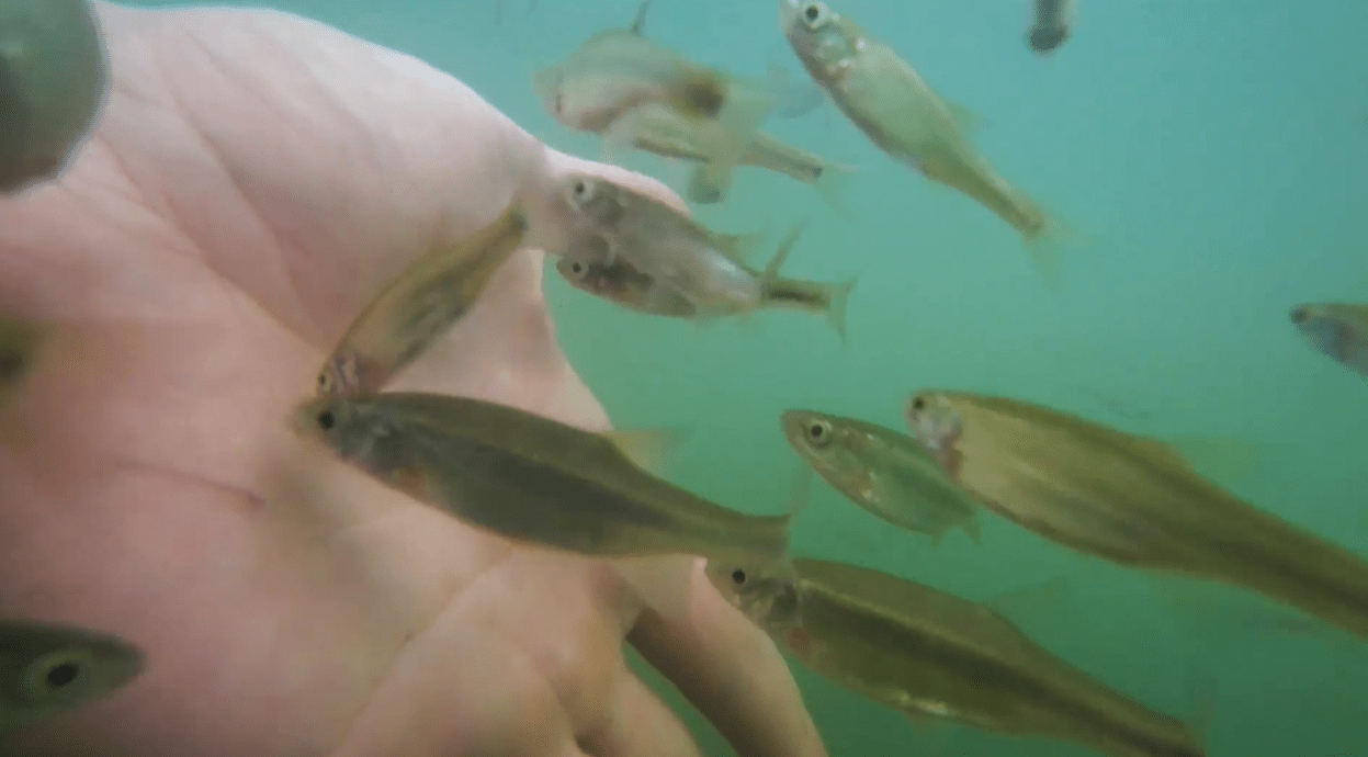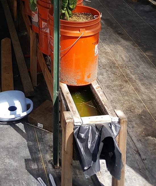 They are positioned above a trough that measures 20 feet long, 8 inches deep, and 8 inches wide, which holds water that houses hundreds of rosy red minnows. The wicking cups extend down into the water, allowing the plant roots to access a constant supply of moisture.