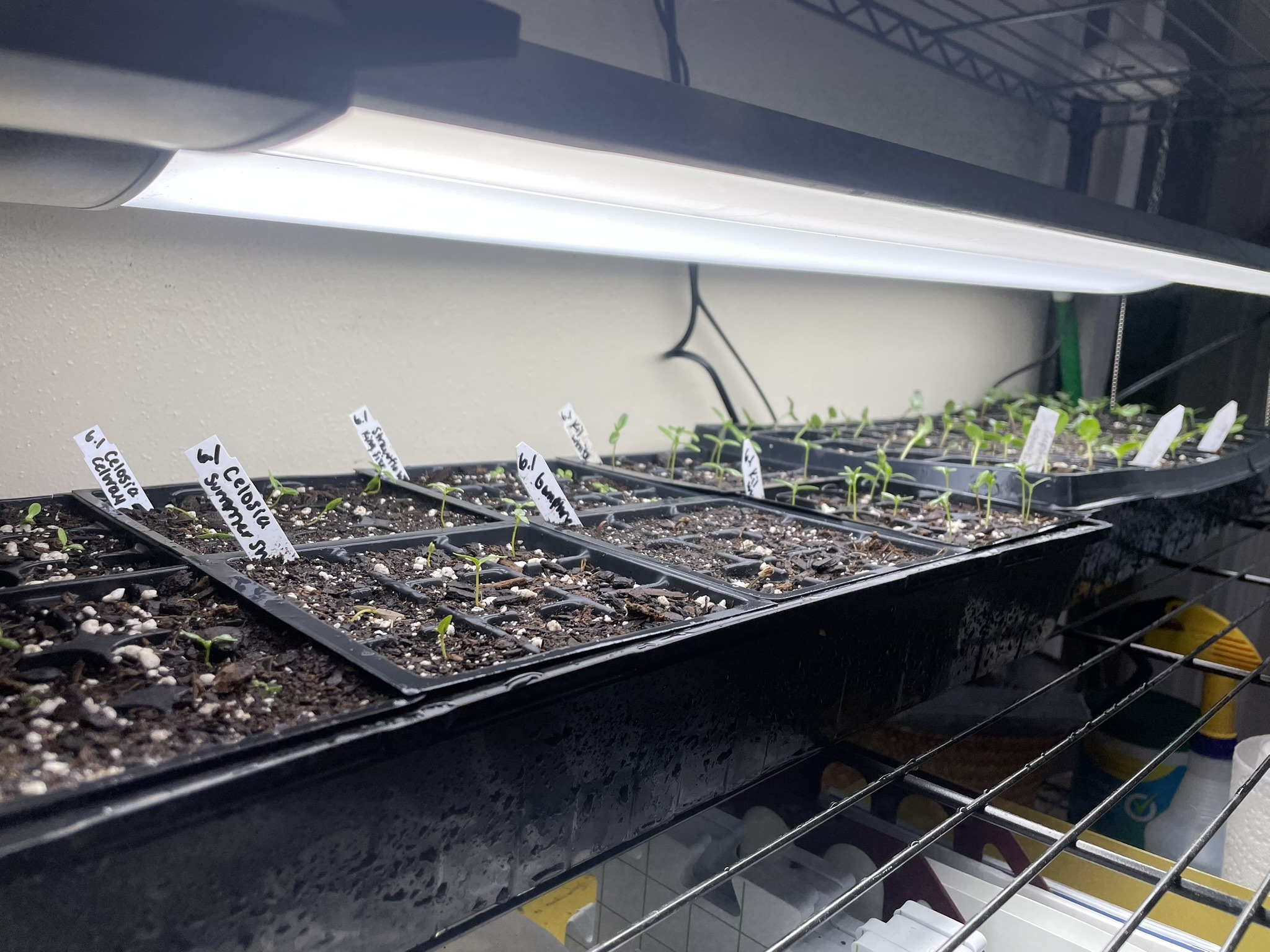 This home setup uses a large wire shelf, greenhouse trays, and grow lights.