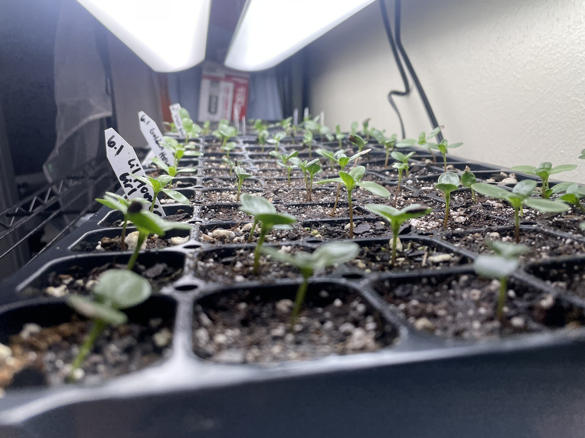 When about half your seeds have sprouted, remove the humidity dome and heat mat and place the trays under bright grow lights. Seedlings need 12–16 hours of consistent light each day to develop strong, healthy stems.
