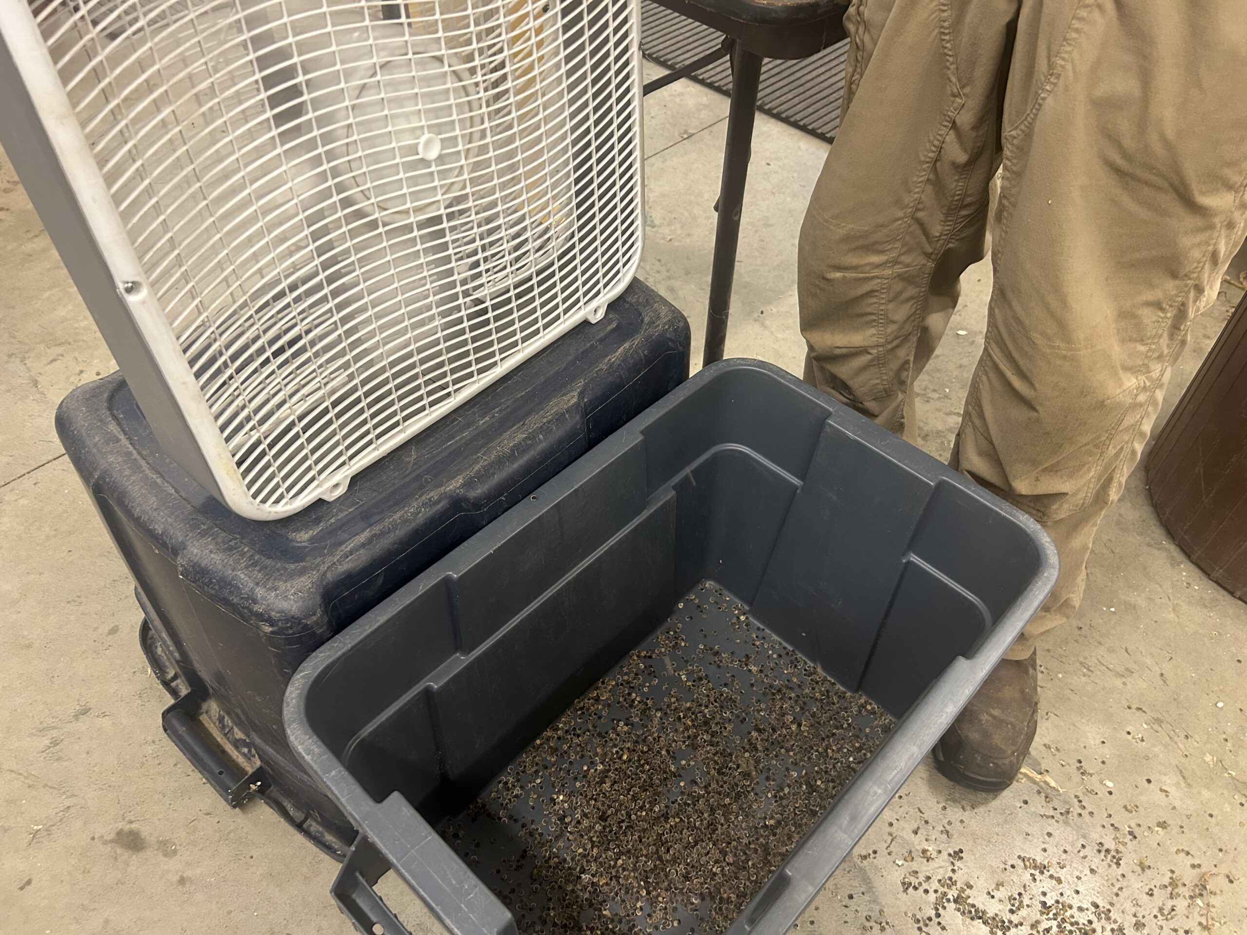 A simple winnowing setup using two large buckets and a box fan.
