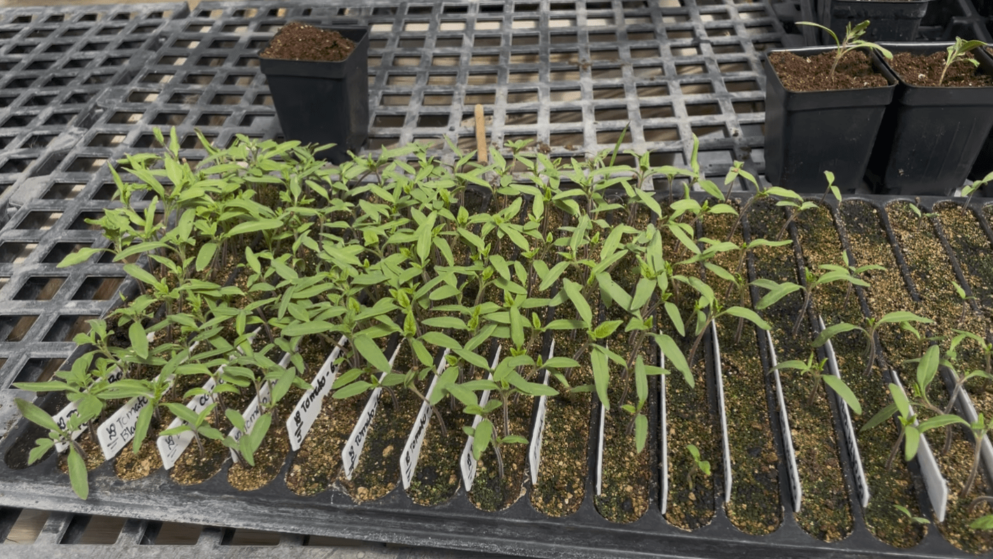 For example, this year, we grew 1,300 tomato plants and sowed the tomato seeds in “20-row” trays. These trays each have 20 small rows, which can each fit 20-30 tomato seeds. A whole 20-row tray can therefore fit upwards of 600 tomato seedlings.