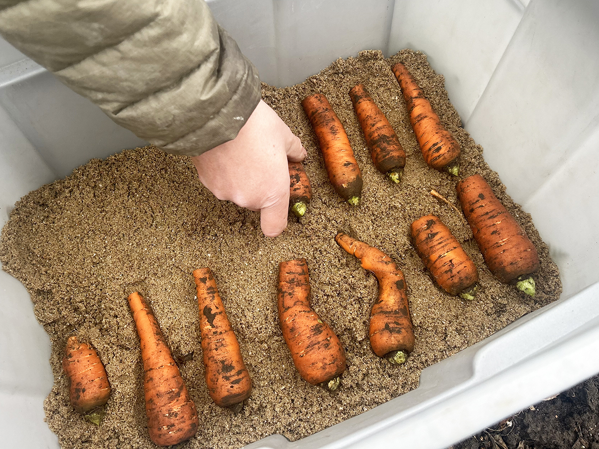 In containers, line the bottom of the container with slightly damp wood shavings, damp sand, or dry leaves. Alternate single layers of carrots with more layers of storage medium. Take care to make sure the carrots are not touching one another.